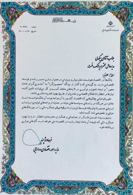 به گزارش اخبارپول، فرهاد دژپسند وزیر امور اقتصادی و دارایی در این لوح سپاس با اشاره به نقش ویژه بانک ها در اقتصاد هوشمند و هموار سازی مسیر رشد و توسعه، بهبود عملکرد مالی بانک ها را زمینه ساز رشد اقتصاد ملی توصیف کرده است.