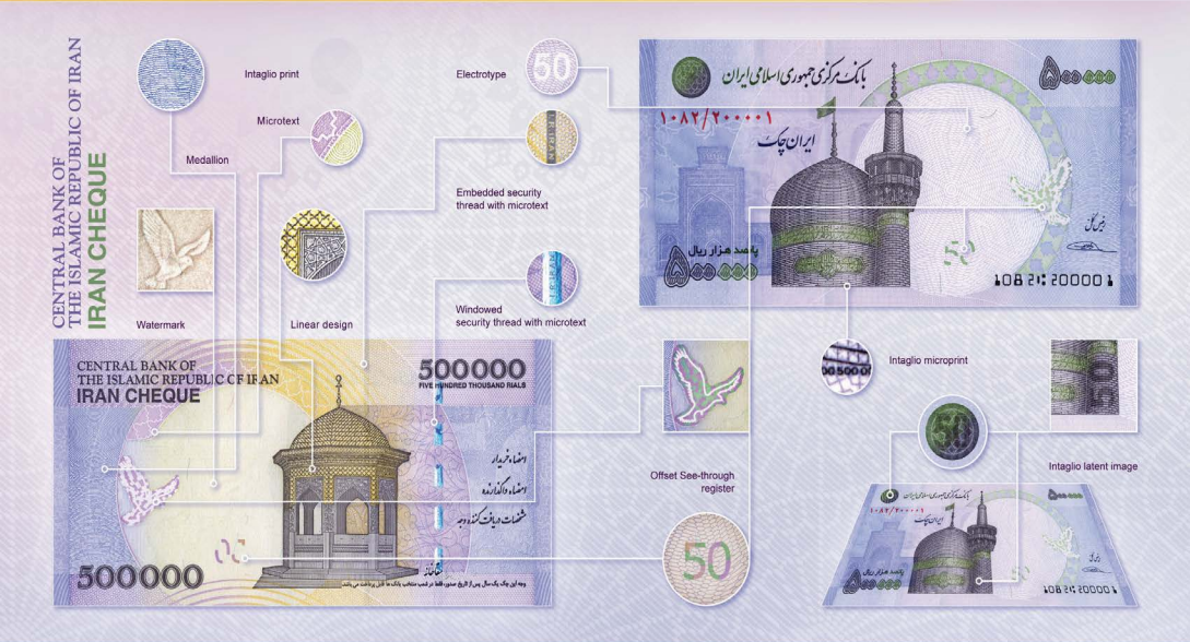 ویژگی‌های امنیتی ایران چک ۵۰۰۰۰۰ریالی طرح قدیم
