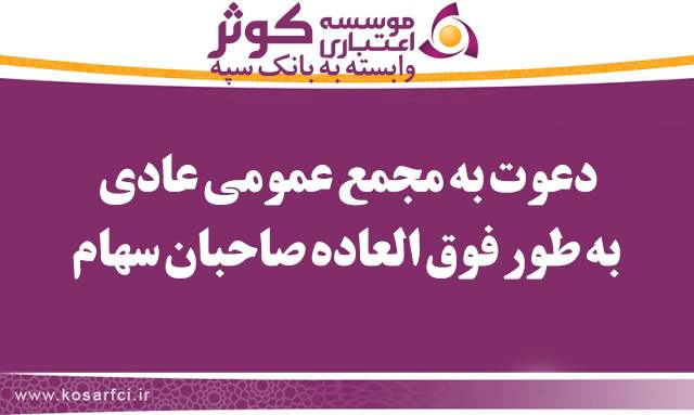 به گزارش اخبارپول، بدینوسیله از تمام سهامداران شرکت موسسه اعتباری کوثر مرکزی (سهامی عام) به شماره ثبت ۴۳۴۲۵۹ و شناسه ملی۱۰۳۲۰۸۴۹۵۸۲ دعوت می شود، تا در جلسه مجمع عمومی عادی به طور فوق العاده سالیانه صاحبان سهام شرکت برای سال مالی منتهی به ۲۹ اسفند ۱۳۹۶، ۲۹ اسفند ۱۳۹۷ و مجمع عمومی فوق العاده ادغام صاحبان سهام که در باشگاه بانک سپه واقع در خیابان مطهری برگزار می گردد، مورخ ۲۶ اسفند ۱۳۹۸حضور بهم رسانند.