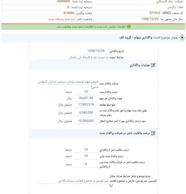بر اساس اطلاعیه منتشر شده، بانک گردشگری ۱۵ درصد سهام شرکت توسعه سیاحان سرزمین ایرانیان «سهامی خاص» به قیمت هر سهم ۳۹.۶۹۷.۵۹ ریال با جمع معامله ۱۷.۸۶۳.۹۱۸ میلیون ریال، با بهای تمام شده سهام یا حق تقدم واگذار شده در دفاتر شرکت به مبلغ ۴.۵۴۰.۰۰۰ میلیون ریال و با سود و زیان واگذاری پس از کسر مخارج انتقال به مبلغ ۱۲.۳۹۴.۴۰۰۰ میلیون ریال را واگذار کرد.