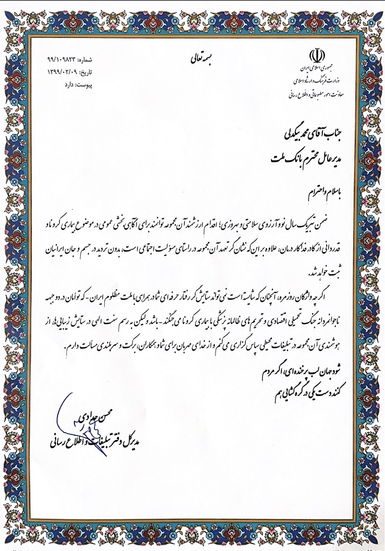 وی در این نامه با بیان این نکته که واژگان روزمره نمی تواند آنچنان که باید ستایشگر رفتار حرفه‌ای بانک ملت در همراهی با ملت مظلوم ایران باشد که همزمان در دو جبهه ناجوانمردانه جنگ اقتصادی و تحریم های ظالمانه پزشکی با بیماری کرونا می جنگند، تاکید کرد: هوشمندی بانک ملت در تبلیغات محیطی در زمینه مقابله با بیماری کرونا، شایسته قدردانی است.