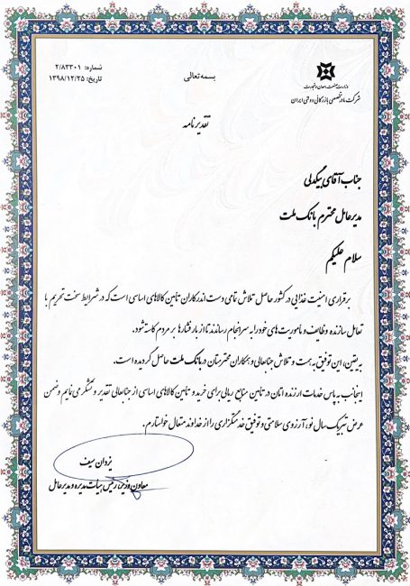 رییس هیات مدیره و مدیرعامل شرکت مادرتخصصی بازرگانی دولتی ایران با تاکید بر این نکته که موفقیت در تامین امنیت غذایی به همت کارکنان و مدیران بانک ملت، به دست آمده است، از دست اندرکاران این بانک به دلیل ارائه خدمات ارزنده در تامین منابع ریالی برای خرید و تامین کالاهای اساسی سپاسگزاری کرد.