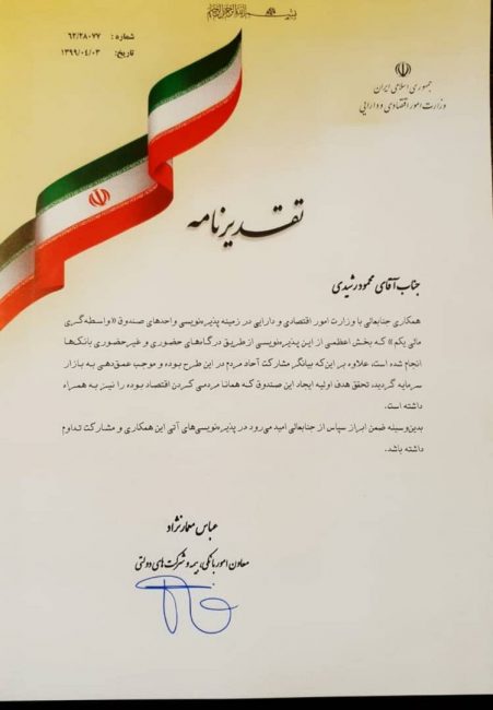 معاون امور بانکی، بیمه و شرکت های دولتی وزیر اقتصاد در این لوح ها تاکید کرده است: این پذیره نویسی علاوه بر این که بیانگر مشارکت آحاد مردم در این طرح بوده و موجب عمق‌دهی به بازار سرمایه شده است، تحقق هدف اولیه ایجاد این صندوق که همانا مردمی کردن اقتصاد بوده است نیز به همراه داشته است.