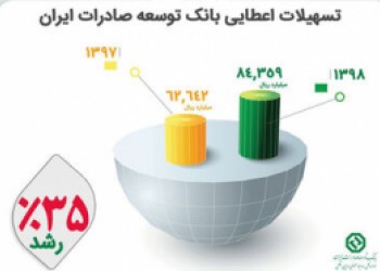 به گزارش اخبارپول، تسهیلات اعطایی بانک توسعه صادرات ایران در سال ۱۳۹۸ بیش از ۸۴ میلیارد و ۳۵۹ میلیون ریال بوده که نسبت به مدت مشابه سال قبل از آن ۳۵ درصد رشد داشته است.