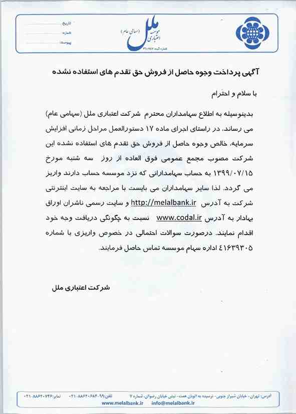 گفتنی است سایر سهامداران می بایست با مراجعه به سایت اینترنتی شرکت به آدرس www.melalbank.ir و سایت رسمی ناشران اوراق بهادار به آدرس www.codal.ir نسبت به چگونگی دریافت وجوه خود اقدام کنند.
