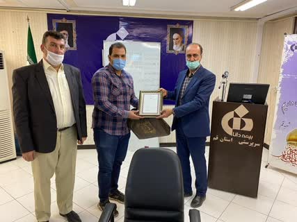 لوح سپاس اعطایی به نماینده شعبه قم از طرف مدیرعامل بیمه دانا به وی اهدا شد.