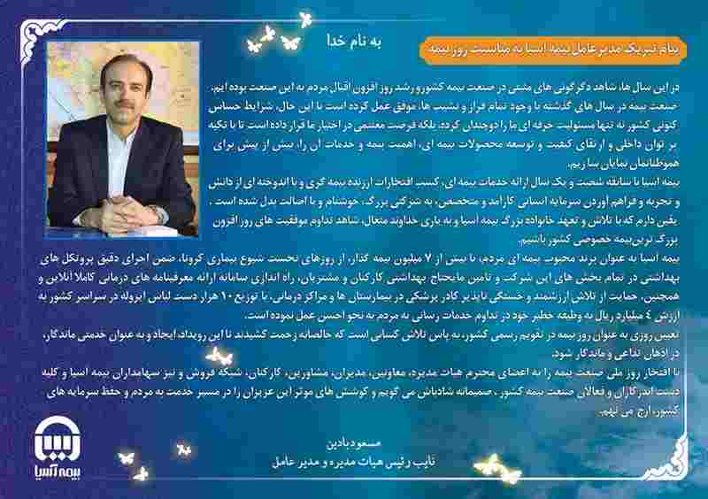 با افتخار روز ملی صنعت بیمه را به اعضای هیات مدیره، معاونین، مدیران، مشاورین، کارکنان، شبکه فروش و نیز سهامداران بیمه آسیا و تمام دست اندرکاران و فعالان صنعت بیمه کشور، صمیمانه شادباش می گویم و کوشش های موثر این عزیزان را در مسیر خدمت به مردم و حفظ سرمایه های کشور، ارج می نهم.