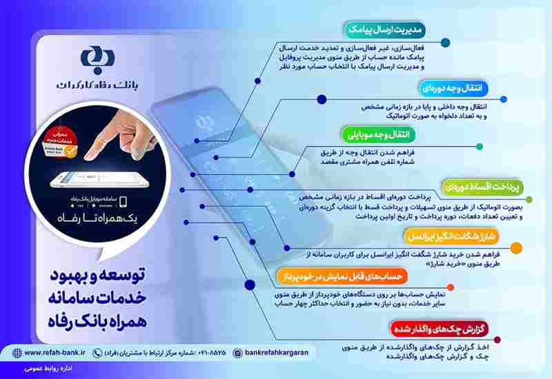 به گزارش اخبارپول از بانک رفاه، در راستای توسعه و تکمیل خدمات بانکداری الکترونیکی و به منظور بهینه سازی و بهبود کیفیت سامانه موبایل بانک رفاه مبتنی بر سیستم عامل ios، امکانات جدید در سامانه فوق ایجاد شده و مشتریان می توانند از طریق اینفوگرافی پیش رو، از این امکانات نظیر مدیریت ارسال پیامک، انتقال وجه دوره ای، انتقال وجه موبایلی، پرداخت اقساط دوره ای، شارژ شگفت انگیز ایرانسل، حساب های قابل نمایش در خودپرداز و گزارش چک های واگذار شده بهرهمند شوند.