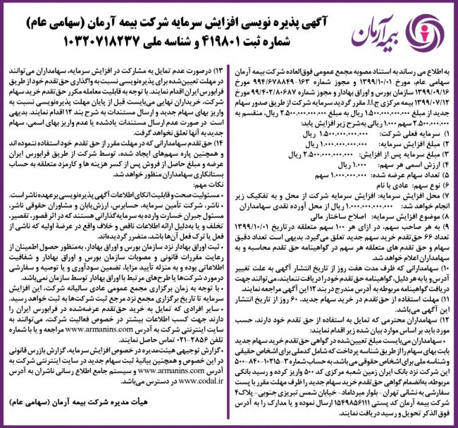 آگهی پذیره‌نویسی افزایش سرمایه بیمه آرمان منتشر شد