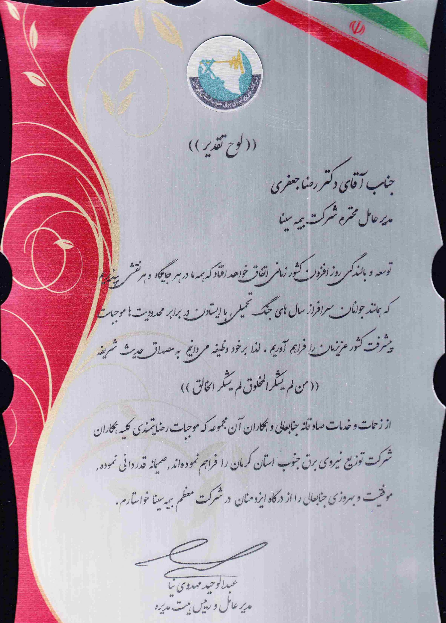 قدردانی شرکت توزیع نیروی برق کرمان از خدمات صادقانه بیمه سینا