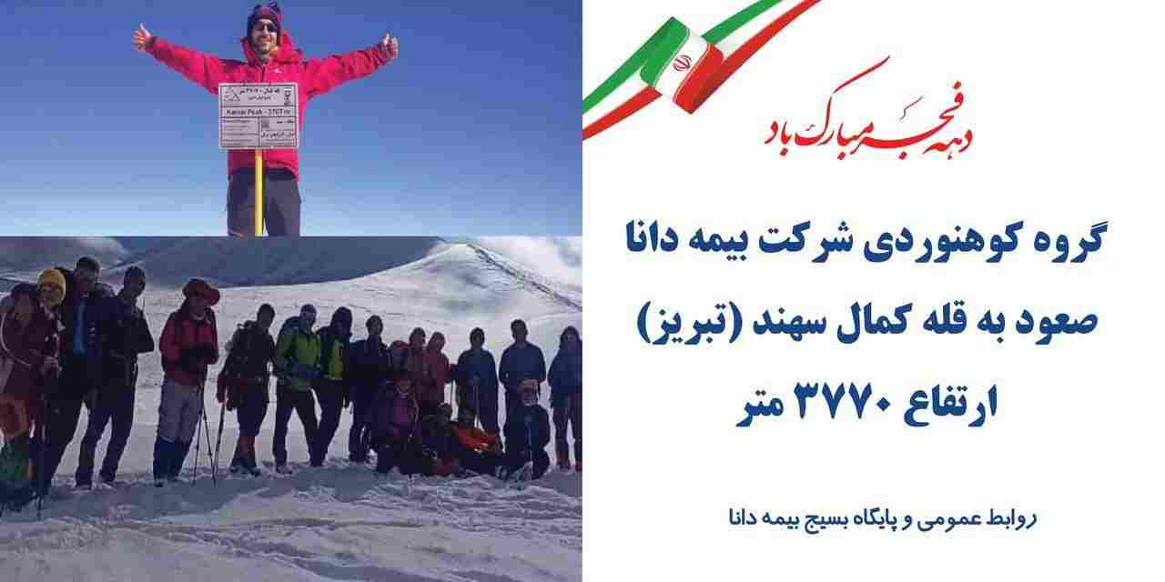 به گزارش اخبارپول، همزمان با ایام الله دهه مبارک فجر و به میمنت چهل و دومین سالگرد پیروزی شکوهمند انقلاب اسلامی ایران، گروه کوهنوردی شرکت بیمه دانا به قله ۳۷۷۰ متری کمال سهند ( تبریز) استان آذر بایجان شرقی به سرپرستی اشکان کاوه فیروز صعود کردند.