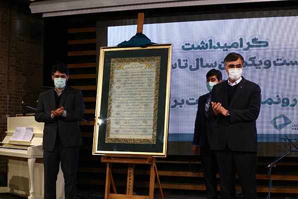 در ادامه این مراسم از منشور مشتری مداری بانک کارآفرین که با قلم استاد غلامحسین امیرخانی خوشنویسی شده بود رونمایی شد و استاد امیرخانی در پیام تصویری که برای این جشن ارسال کرده بود با تبریک ۲۱ سالگی بانک کارآفرین با ابراز امیدواری برای روزهای بهتر برای بانک کارآفرین و قد ردانی از عملکرد بانک در حمایت از کارآفرین ها گفت: بانک کارآفرین جزو بانکهای خصوصی خوشنام ایرانی است که در طی سالهای حیاتش برکات زیادی داشته است و امیدوارم که در دهه سوم فعالیتش نیز بر اساس رویه حمایت از تولید و کارآفرینی قدم بردارد.