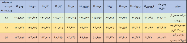 درآمد حاصل ازتسهیلات در بهمن ماه امسال، نسبت به مدت مشابه در سال قبل دارای رشد ۵۵ درصدی بوده است.