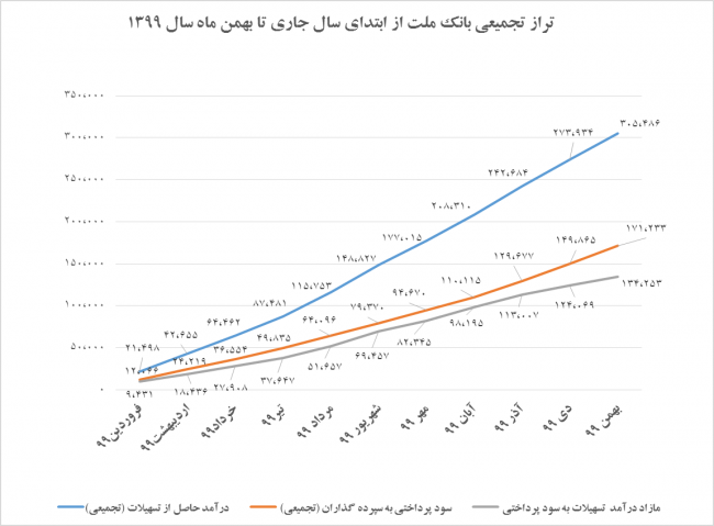 در بهمن ماه سال جاری درآمد حاصل از تسهیلات مبلغ ۳۱,۵۵۲ میلیارد ریال و سود پرداختی به سپرده گذاران مبلغ ۲۱,۳۶۸ میلیارد ریال می باشد که منجر به ثبت تراز عملیاتی ۱۰,۱۸۴ میلیارد ریال در یازدهمین ماه سال شده است. به این ترتیب تراز بانک در بهمن ماه امسال ، ۳۰ درصد بیشتر از مدت مشابه در سال قبل است.