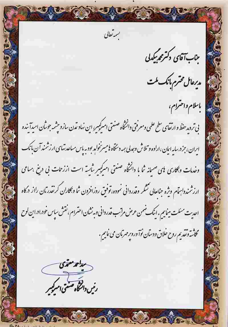 به گزارش اخبارپول، معتمدی رئیس دانشگاه صنعتی امیر کبیر در این لوح با اشاره به خدمات و مساعدت های بانک ملت با این دانشگاه، تلاش و همدلی همه نهادها و دستگاه ها را برای حفظ و ارتقای سطح علمی دانشگاه های کشور لازم دانست و از بیگدلی مدیر عامل و کارکنان بانک ملت به خاطر تلاشها و خدمات ارزشمندشان قدردانی کرد.