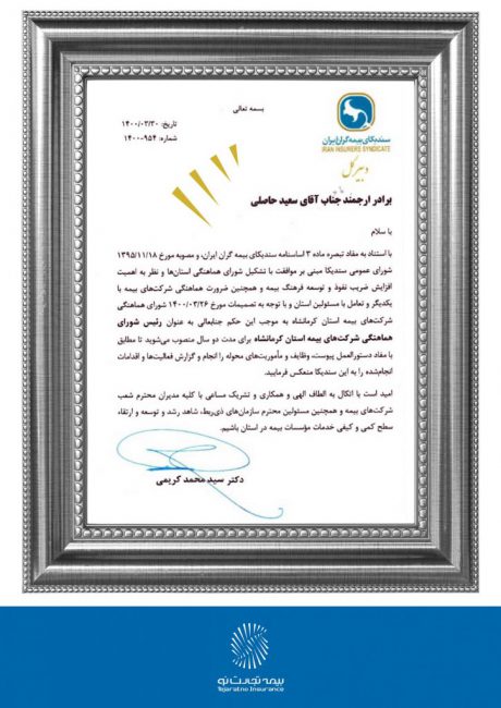 وی، برای سومین بار، از سوی سندیکای بیمه گران ایران، به عنوان رئیس شورای هماهنگی شرکت های بیمه کرمانشاه منصوب شده است. دوره ریاست شورای هماهنگی شرکت های بیمه در استان کرمانشاه دوساله است.
