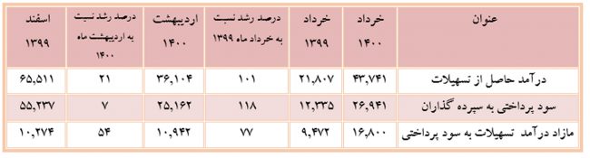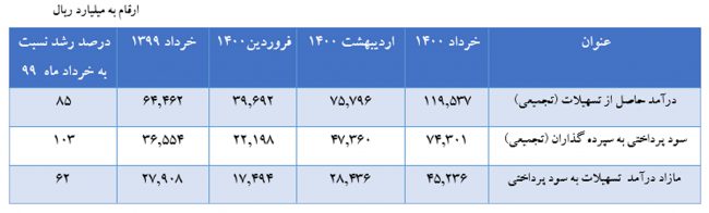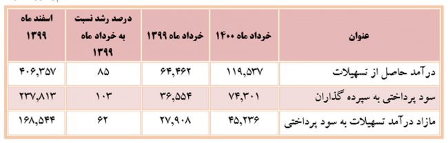 درآمد حاصل از تسهیلات در خردادماه امسال، نسبت به مدت مشابه در سال قبل دارای رشد ۱۰۱ درصدی و نسبت به ماه قبل از رشد ۲۱ درصدی برخوردار بوده است.