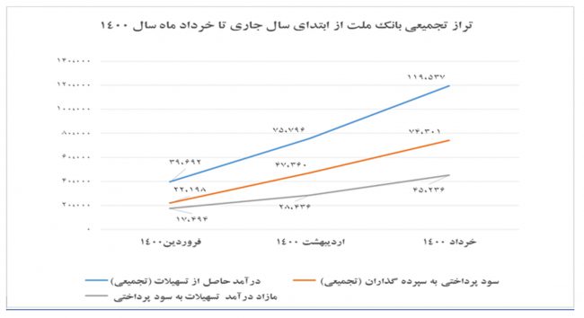 طی خردادماه سال ۱۴۰۰ ، بانک ملت با کسب ۱۱۹,۵۳۷ میلیارد ریال درآمد حاصل از تسهیلات اعطایی و پرداخت ۷۴,۳۰۱ میلیارد ریال سود سپرده گذاری، توانست تراز عملیاتی( حاشیه سود) مثبت ۴۵,۲۳۶ میلیارد ریالی را ثبت کند که با رشد ۶۲ درصدی نسبت به مدت مشابه در سال گذشته (حاشیه سودپرداختی ۲۷,۹۰۸ میلیارد ریالی) عملکردی در خور توجه محسوب می شود. این امر حاکی از استمرار روند بهبود، تسهیل در فرآیند اعطای تسهیلات، رعایت بهداشت اعتباری، عزم راسخ بانک در مصرف بهینه مصارف و کسب سود با کیفیت است.