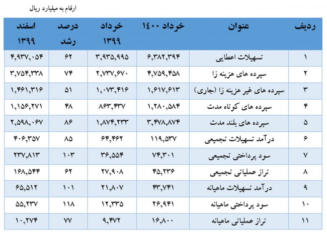 در مجموع کل مانده سپردهها در مقایسه با مدت مشابه سال گذشته با جهش قابل ملاحظه ۶۷ درصدی روبرو شده و از مبلغ ۳,۸۱۱,۰۸۶ میلیارد ریال به ۶,۳۷۷,۰۷۱ میلیارد ریال افزایش یافته است و همچنین نسبت به آخرین ماه سال گذشته ۲۲ درصد رشد نشان می دهد.