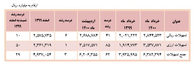 مانده تسهیلات ارزی در خرداد ماه امسال در مقایسه با مدت مشابه در سال گذشته با رشد ۸۵ درصدی از مبلغ ۱,۹۱۴,۷۷۳ میلیارد ریال به ۳,۵۳۷,۸۷۲ میلیارد ریال افزایش یافته است که به طور عمده ناشی از اعمال نرخ تسعیر ارز بوده است.