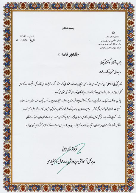 به گزارش اخبارپول، خانم قائد امینی مدیر کل آموزش و پرورش استان چهار محال و بختیاری در این لوح از همکاری صمیمانه محمد بیگدلی مدیرعامل بانک ملت و دیگر مدیران و کارکنان این بانک با آموزش و پرورش چهار محال و بختیاری و اعطای تسهیلات خرید لوازم خانگی برای جامعه فرهنگیان سپاسگزاری کرده است.