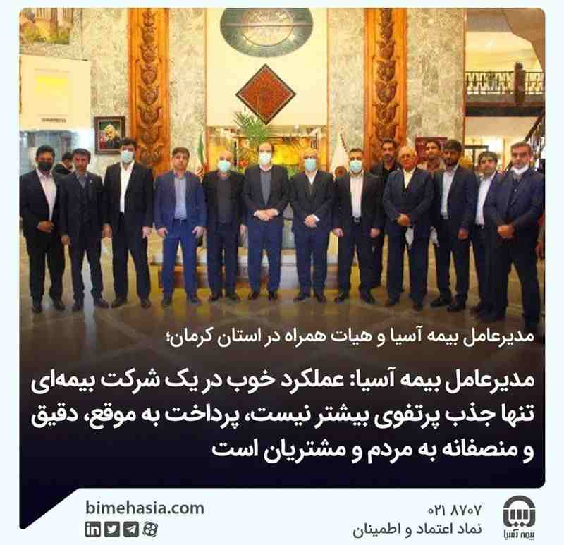 گفتنی است، بهروز ناظمی، معاون امور استانها و شبکه فروش، غلامرضا سرلک، معاون فنی بیمه های اموال، احمد جهاندیده، معاون توسعه سرمایه انسانی و پشتیبانی و محمد مظفر خرمی، مدیر روابط عمومی در این سفر مدیر عامل بیمه آسیا را همراهی می کردند.