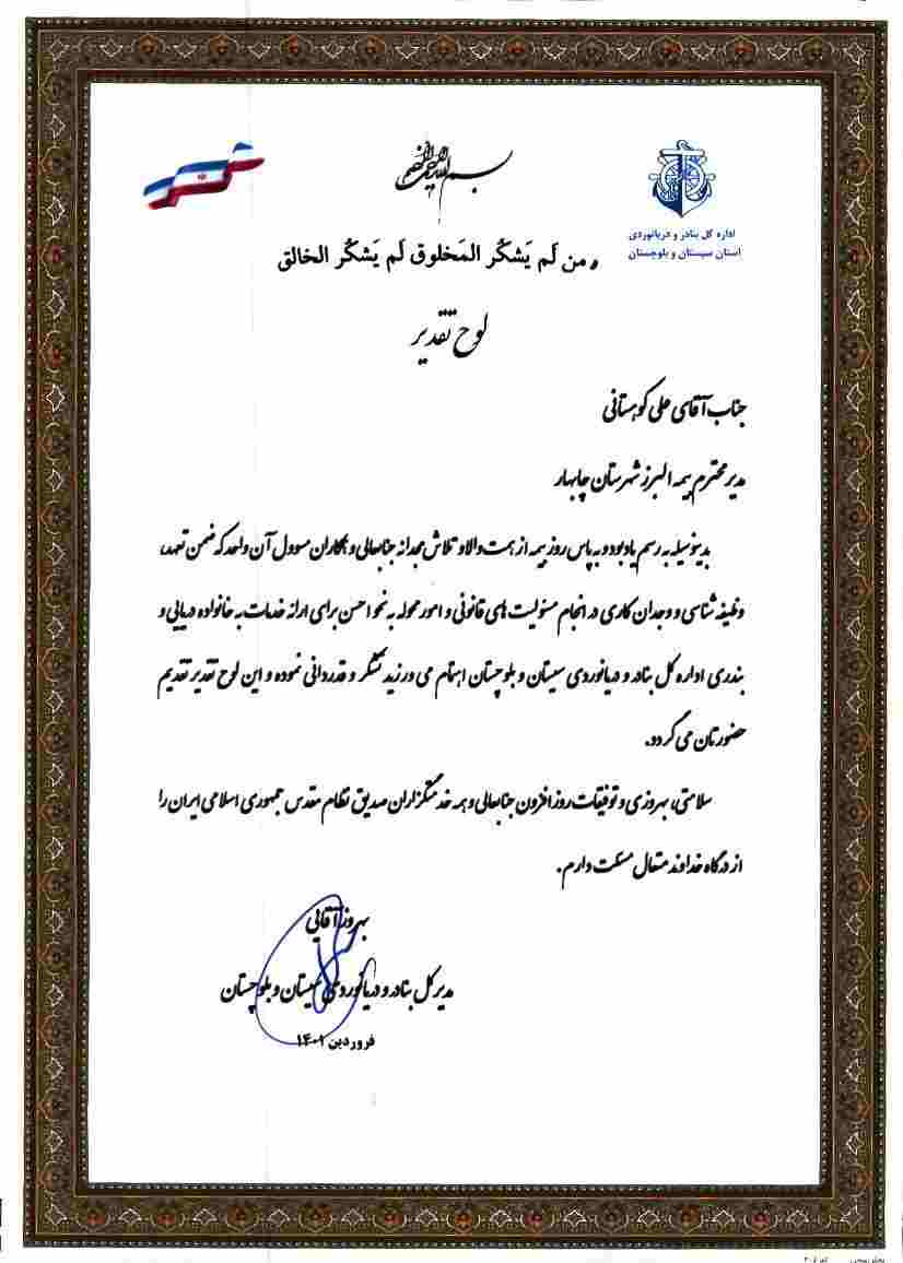 این گزارش حاکی است، در این لوح قدردانی آمده است: از همت والا و تلاش مجدانه رییس و همکاران مسوول بیمه البرز که ضمن تعهد، وظیفه شناسی و وجدان کاری در انجام مسوولیت های قانونی و امور محوله به نحو احسن برای ارایه خدمات به خانواده دریایی و بندری اداره کل بنادر و دریانوردی سیستان و بلوچستان اهتمام می ورزید، تشکر و قدردانی می کنم.