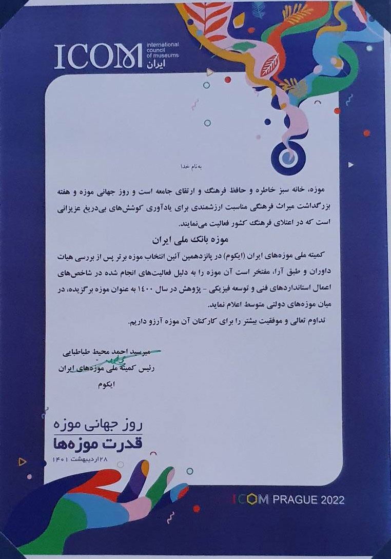 هیات داوران در این دوره و انتخاب موزه برتر، موزه بانک ملّی ایران را در شاخص‌های پژوهش، اعمال استانداردهای فنی و توسعهٔ فیزیکی در سال ۱۴۰۰ به عنوان‌ موزه برگزیده در میان موزه‌های دولتی متوسط کشور انتخاب کردند.