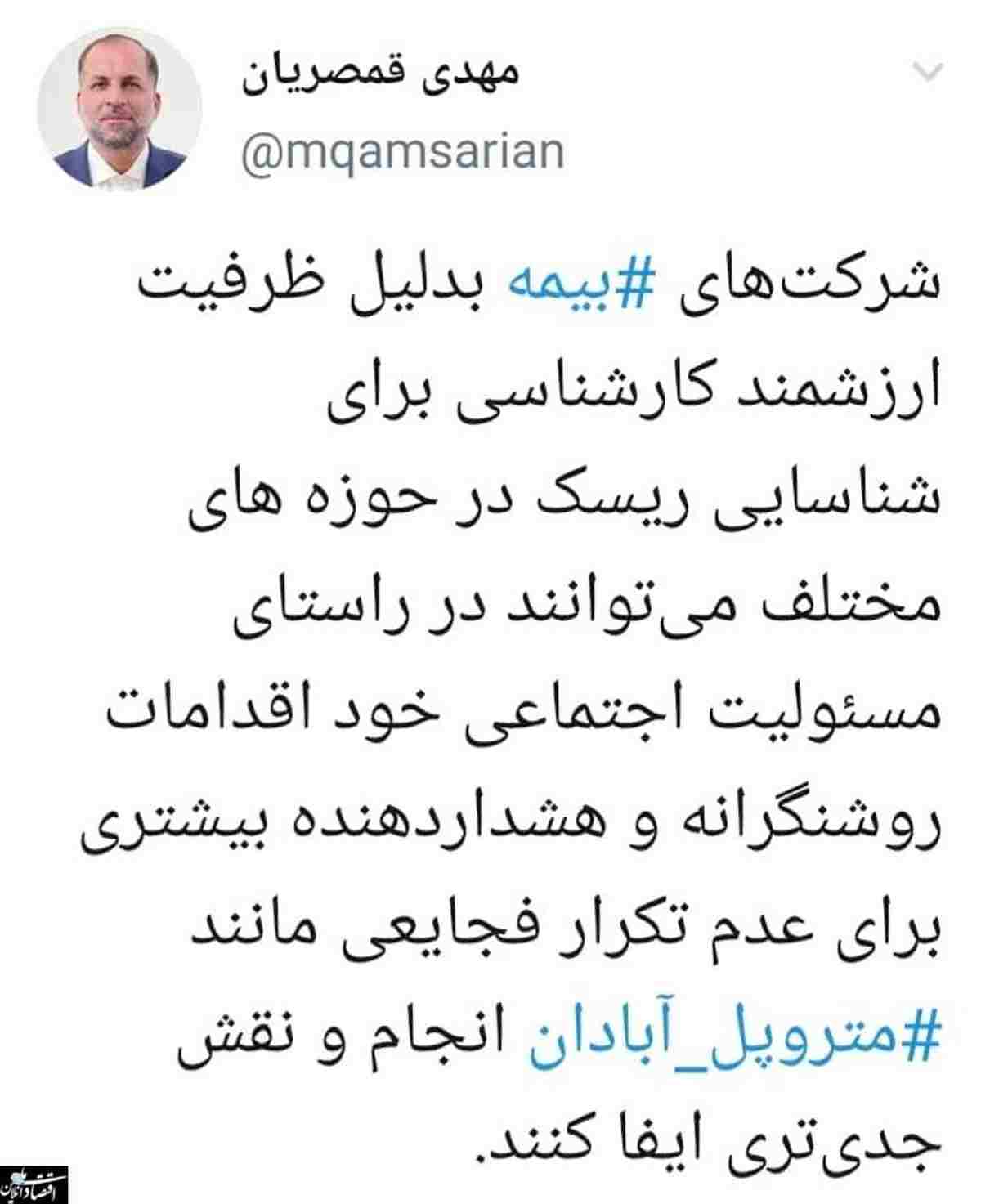 شرکت های بیمه بدلیل ظرفیت ارزشمند کارشناسی برای شناسایی ریسک در حوزه های مختلف می توانند در راستای مسئولیت اجتماعی خود اقدامات روشنگرانه و هشدار دهنده بیشتری برای عدم تکرار فجایعی مانند متروپل آبادان انجام و نقش جدی تری ایفا کنند.