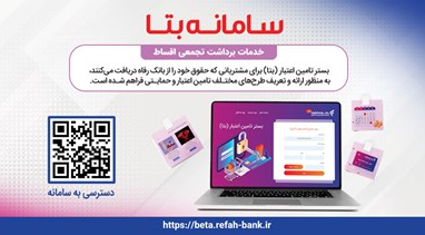 لازم به ذکر است، مشتریان واجدشرایط بانک رفاه کارگران، میتوانند برای بهرهمندی از امکانات “سامانه بتا” به سایت این سامانه به نشانی اینترنتی: https://beta.refah-bank.ir مراجعه کنند.