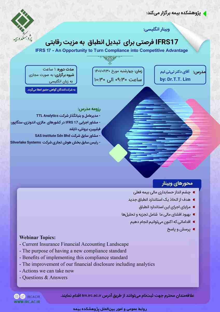 از جمله محورهای این وبینار میتوان به چشم انداز حسابداری مالی بیمه فعلی، هدف از اتخاذ یک استاندارد انطباق جدید، مزایای اجرای این استاندارد انطباق، بهبود افشای مالی شامل تجزیه و تحلیلها، اقداماتی که اکنون میتوانیم انجام دهیم و همچنین پرسش و پاسخ اشاره کرد.