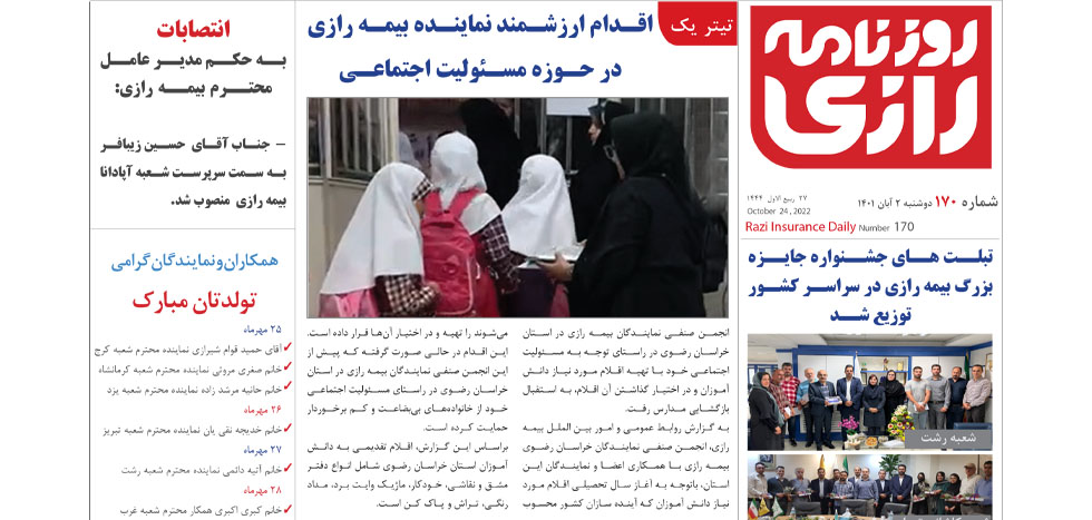 به گزارش اخبارپول، روزنامه شماره ۱۷۰ رازی در تاریخ دوشنبه ۲ آبانماه منتشر شد که در این شماره به اخباری در زمینه اقدام ارزشمند نماینده بیمه رازی در حوزه مسئولیت اجتماعی، اقدام هماهنگ بخشهای مختلف بیمه رازی، انتصاب مدیر جدید شعبه آپادانا و … پرداخته شده است.