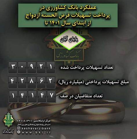 این گزارش می افزاید: در حال حاضر حدود ۱۴ هزار نفر در صف انتظار دریافت تسهیلات قرض الحسنه ازدواج از بانک کشاورزی قرار دارند که بر اساس نوبت و با تخصیص ماهانه اعتبار، پرداخت تسهیلات در حال انجام است.
