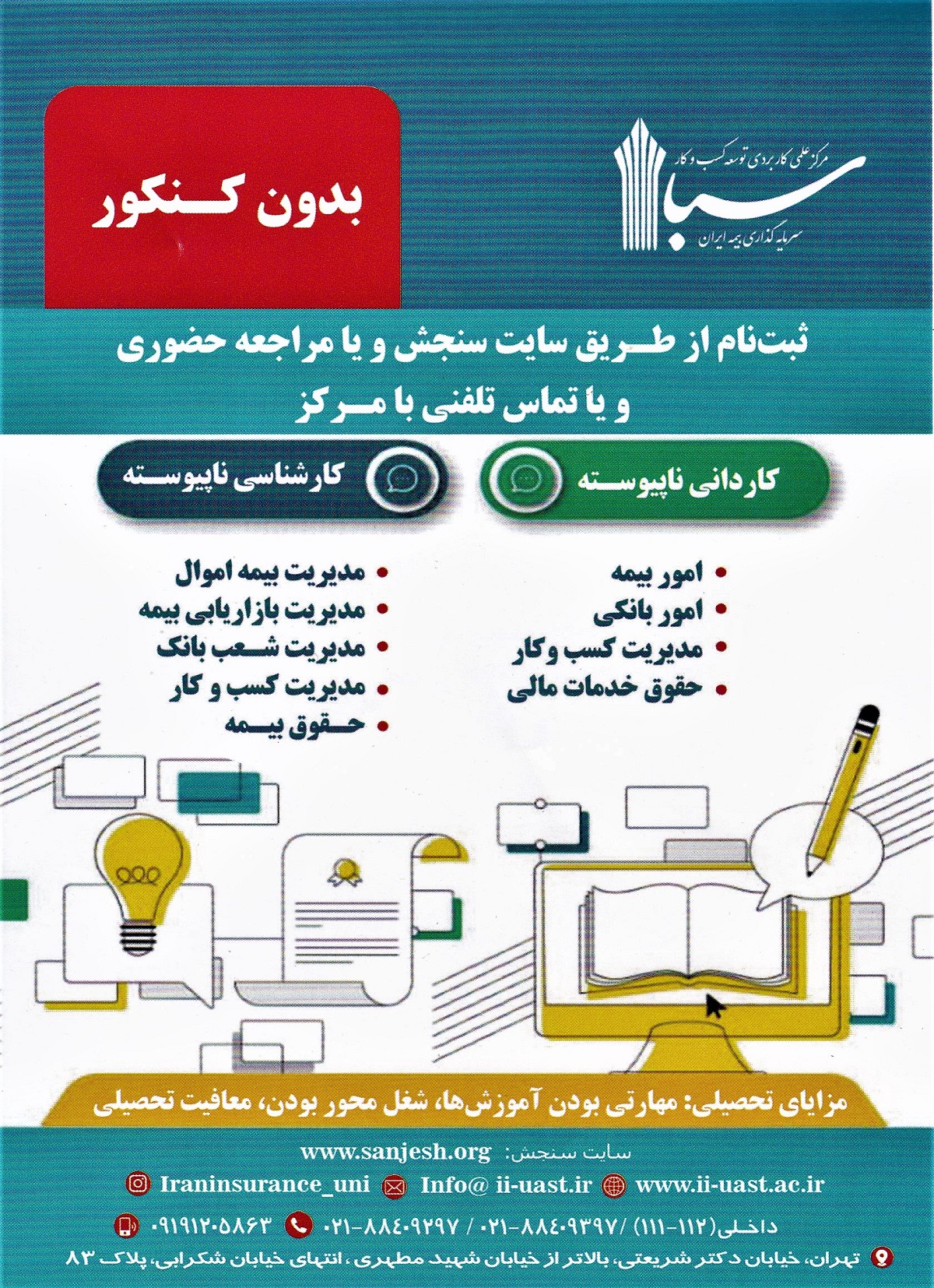 به گزارش اخبارپول، مرکز آموزش علمی کاربردی توسعه کسب و کار سبا متعلق به هلدینگ سرمایه گذاری بیمه ایران برای ترم بهمن ماه ۱۴۰۱در مقطع کاردانی حرفه ای امور بیمه و مقاطع کارشناسی مدیریت بیمه – بیمه های اموال، مدیریت بازاریابی بیمه و کارشناسی حقوق بیمه و همچنین در رشته مدیریت کسب و کار در مقطع کاردانی و کارشناسی، دانشجو می پذیرد.
