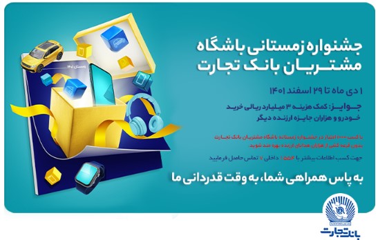 «به پاس همراهی شما، به وقت قدردانی ما»؛ اگر جایی این شعار را شنیدید یا دیدید، بدانید که همه چیز برای شرکت کردنتان در جشنواره زمستانه باشگاه مشتریان بانک تجارت فراهم شده است. جشنواره‌ای که حالا و بعد از یک ماه از آغازش، شاهد استقبال قابل توجهی از طرف مشتریان بانک بوده و رقابت بر سر برنده شدن کمک هزینه خرید خودرو، ده‌ها گوشی تلفن همراه، ساعت هوشمند و کنسول بازی را تنگاتنگ کرده است. اما برای اینکه شانس برنده شدن کمک هزینه ۳۰۰ میلیون تومانی خرید خودرو برایتان بیشتر کنید باید بدانید که با محاسبه مانده امتیاز شما در پایان جشنواره به صورت خودکار در قرعه‌کشی کمک هزینه خودرو محاسبه خواهد شد. علاوه بر این، حتماً باید خبر داشته باشید که قرعه‌کشی گوشی تلفن همراه، ساعت هوشمند، هدست، کیف اعتباری ۵۰ میلیون ریالی و ۳ میلیون ریالی هم در پایان هر ماه و در سه دوره انجام می‌شود.