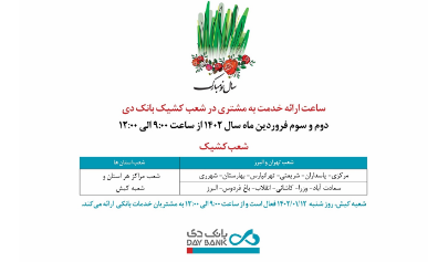 گفتنی است شعبه کیش در روز شنبه ۱۲ فروردین ۱۴۰۲ از ساعت۹ تا ۱۳ خدمات بانکی را به مشتریان ارائه خواهد کرد.