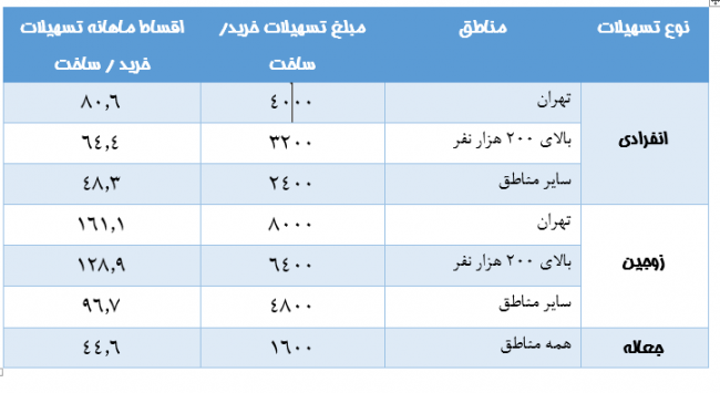 اقساط تسهیلات مزبور، در سقف های مصوب شورای پول و اعتبار و با در نظرگرفتن سهم مسکن از بودجه خانوار در مناطق شهری تعیین شده است؛ به گونهای که به طور مثال در تهران، اقساط تسهیلات یادشده برای سقف فردی ۴۰۰ میلیون تومانی با لحاظ تسهیلات جعاله (به مبلغ ۱۶۰ میلیون تومان) ۱۲ میلیون و ۵۰۰ هزار تومان است.