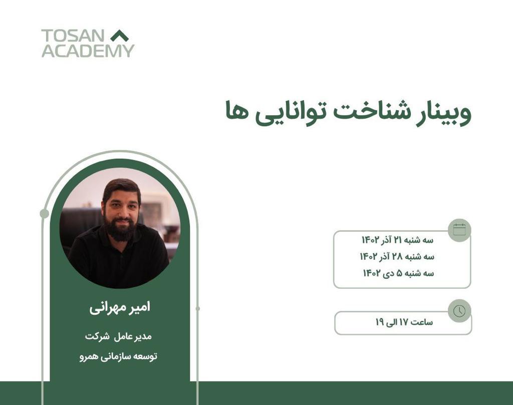 دوره آموزشی سه روزه شناخت توانایی‌ها با تدریس امیر مهرانی، مدیرعامل شرکت توسعه و تحول سازمانی همرو، از روز سه‌شنبه ۲۱ آذرماه ۱۴۰۲ به صورت آنلاین برگزار می‌شود.