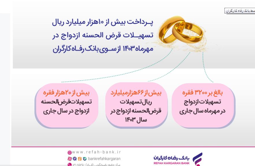 لازم به ذکر است، بانک رفاه کارگران از ابتدای سال ۱۴۰۳ تا پایان مهر ماه در مجموع ۲۰,۳۱۹ فقره تسهیلات قرض‌الحسنه ازدواج و تهیه جهیزیه به مبلغ بیش از ۶۶ هزار میلیارد ریال پرداخت کرده است.
