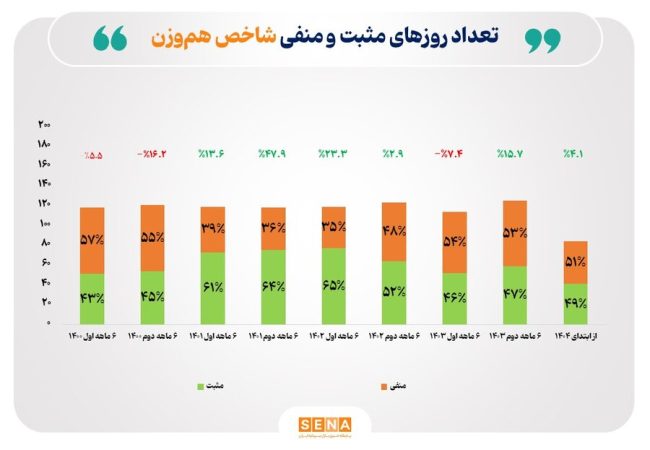 افزون براین، داده‌های آماری مدیریت نظارت بر بورس‌های سازمان بورس و اوراق بهادار از وضعیت شاخص هم‌وزن در ۵ سال اخیر نیز حاکی از آن است که ۴۳ درصد روزها در ۶ ماه ابتدای سال ۱۴۰۰ و ۴۹ درصد روزها در ابتدای سال ۱۴۰۴، مثبت بوده است.