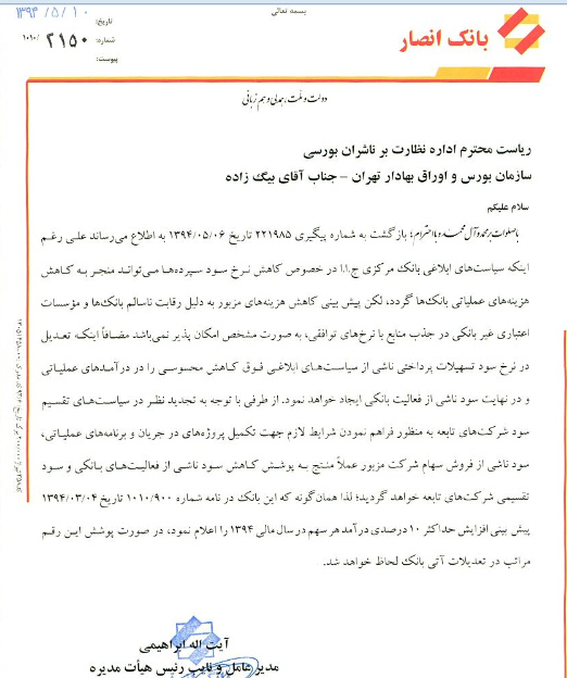 براساس این گزارش، حال این مقام مسئول در نامه دیگری درباره پوشش ۴۸ درصدی سود در سه ماه اول سال توضیحاتی به شرح ذیل ارایه کرد: