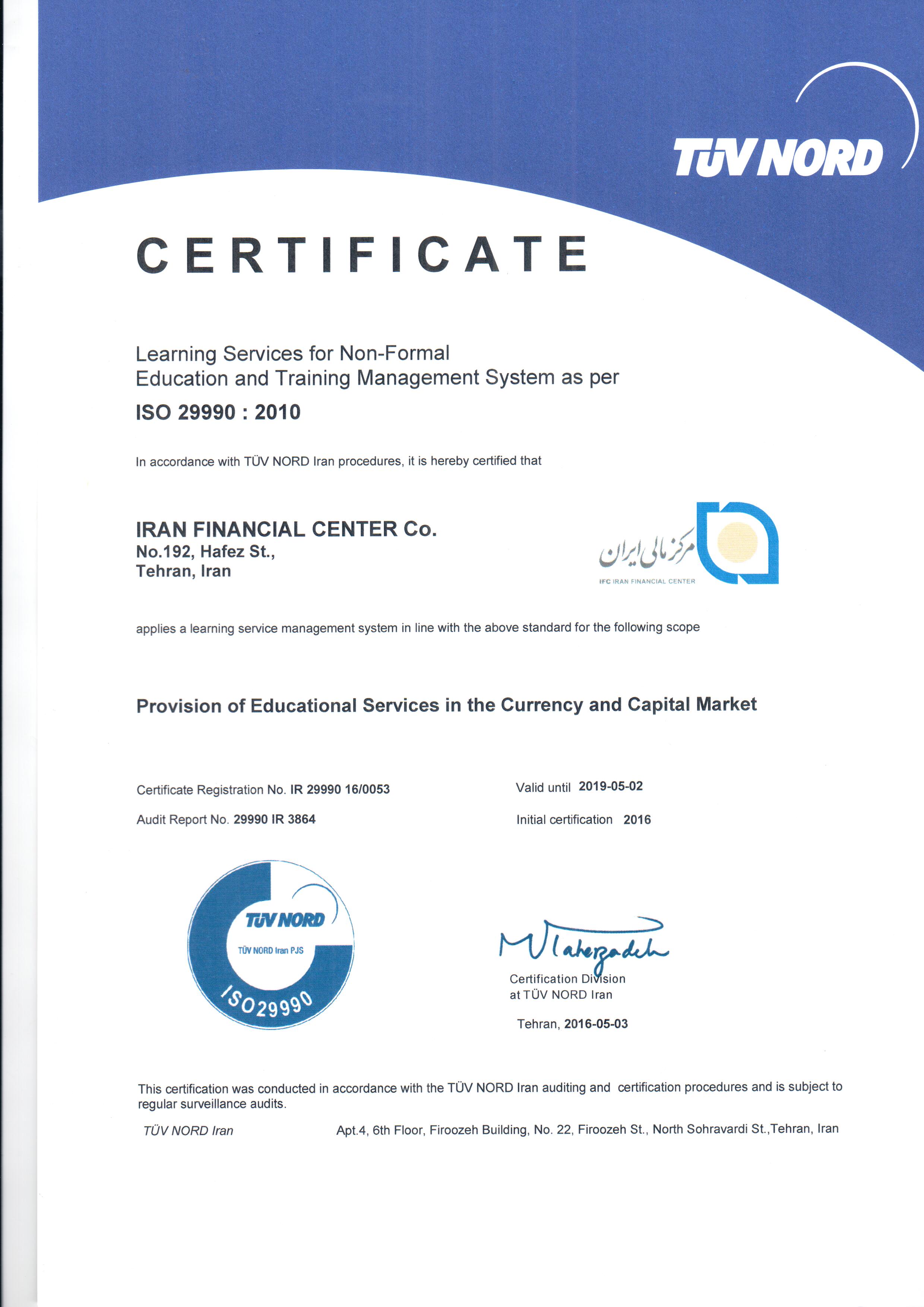 به گفته وی، «مرکز مالی ایران» در یک دوره شش ماهه با پیاده سازی الزامات و مستندسازی اقدامات برای دریافت این گواهینامه آماده شده که سرانجام ۱۸ اسفند ماه ۱۳۹۴ ممیزی اصلی صورت گرفته و پس از آن در سیزدهم اردیبهشت ماه سال ۹۵ گواهینامه نهایی صادر شده است. نقوی درباره مزایای پیاده سازی استاندارد «ISO 29990:2010» گفت: بهبود کیفیت سیستم خدمات آموزشی، شفافیت در خدمات یادگیری، افزایش توان رقابتی خدمات ارایه شده، تحلیل شفاف برنامههای آموزشی، تمرکز بر نیازهای فراگیران، نتایج قابل اندازهگیری در ارزشیابی خدمات آموزشی، پایش مستمر و کنترل فرآیند یادگیری و رسمیت بین المللی و توسعه فعالیتهای آموزش در اثر اجرای استاندارد «ISO 29990» مهمترین نتایج مورد انتظار پیادهسازی این استاندارد هستند.