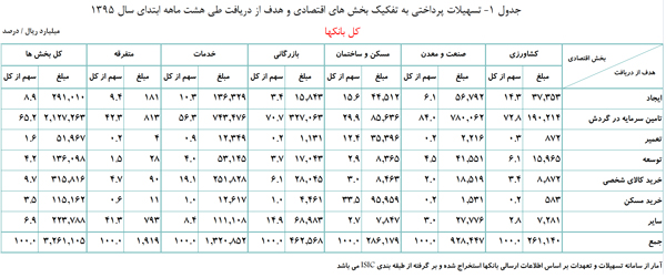 تسهیلات پرداختی بانک‌ها طی هشت ماهه سال ۱۳۹۵ به بخش‌های اقتصادی مبلغ ۳۲۶۱.۱ هزار میلیارد ریال است که در مقایسه با دوره مشابه سال قبل مبلغ ۱۰۶۳.۶ هزار میلیارد ریال (معادل ۴۸.۴ درصد) افزایش داشته است.