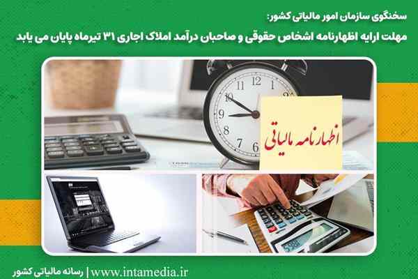 بیشتر بخوانید »سخنگوی سازمان امور مالیاتی کشور اعلام کرد: مطابق قانون مالیاتهای مستقیم، مهلت ارائه اظهارنامه مالیاتی اشخاص حقوقی و همچنین صاحبان…